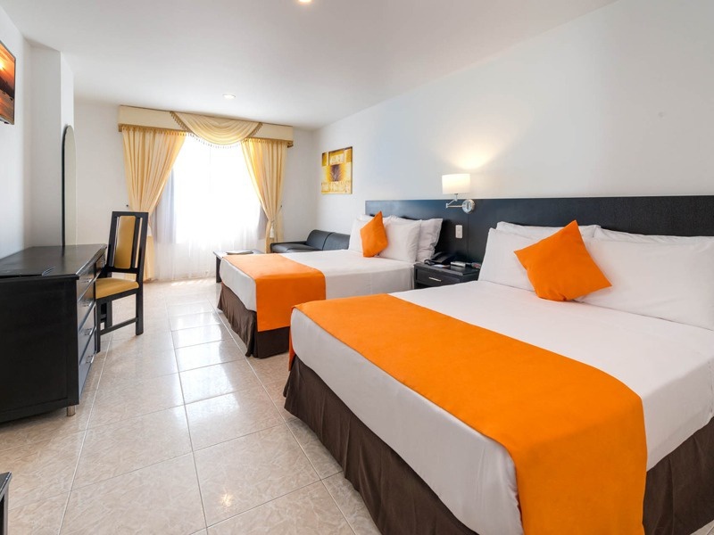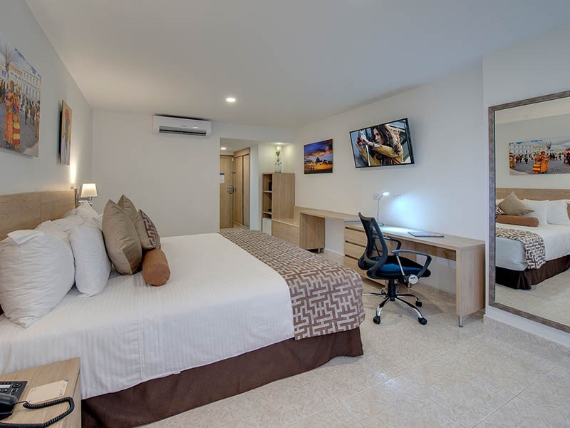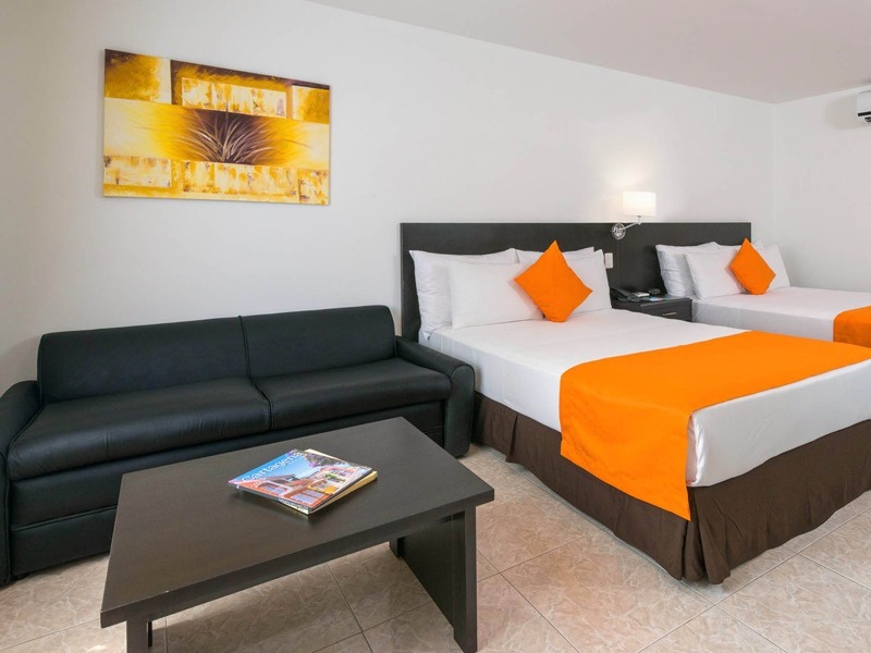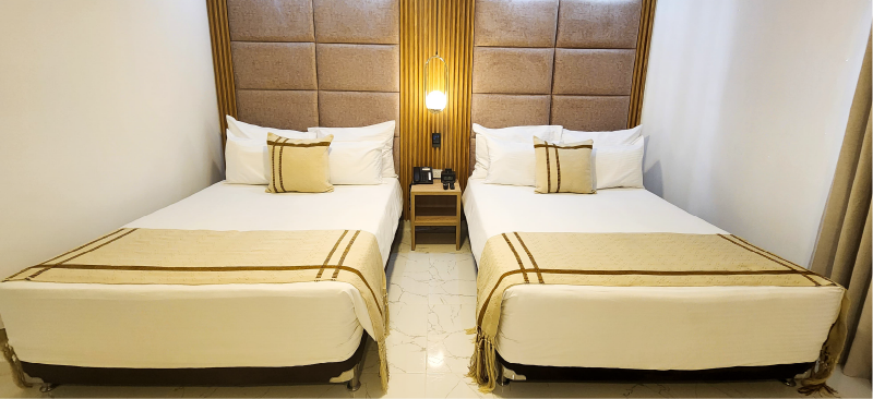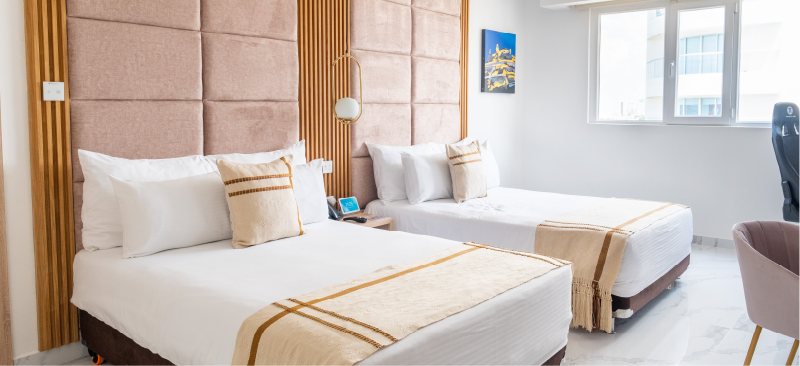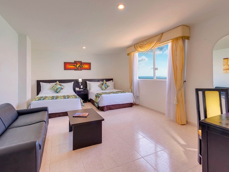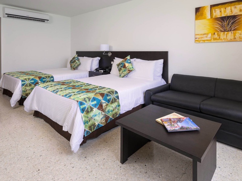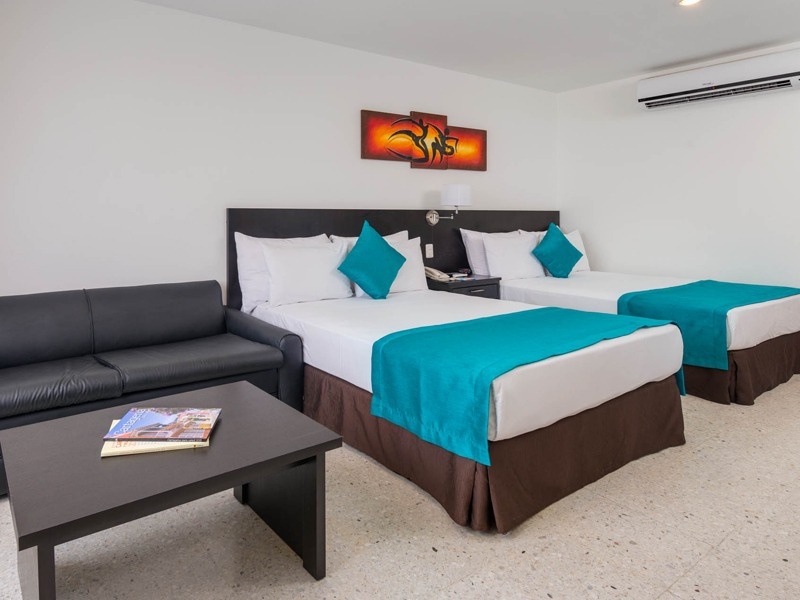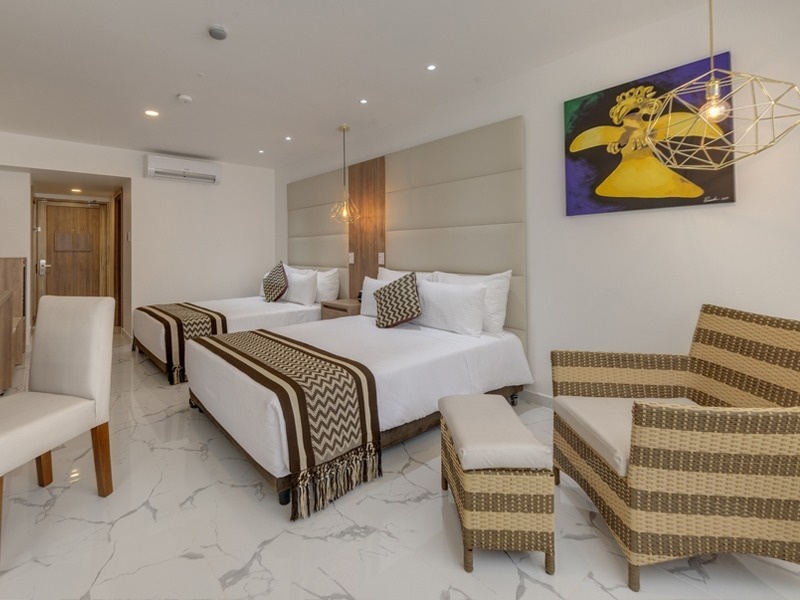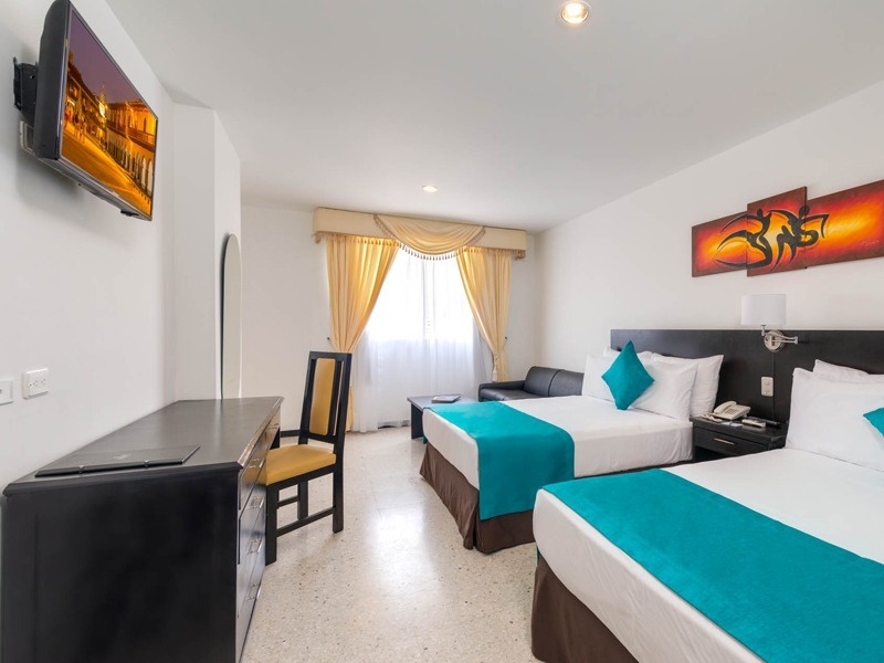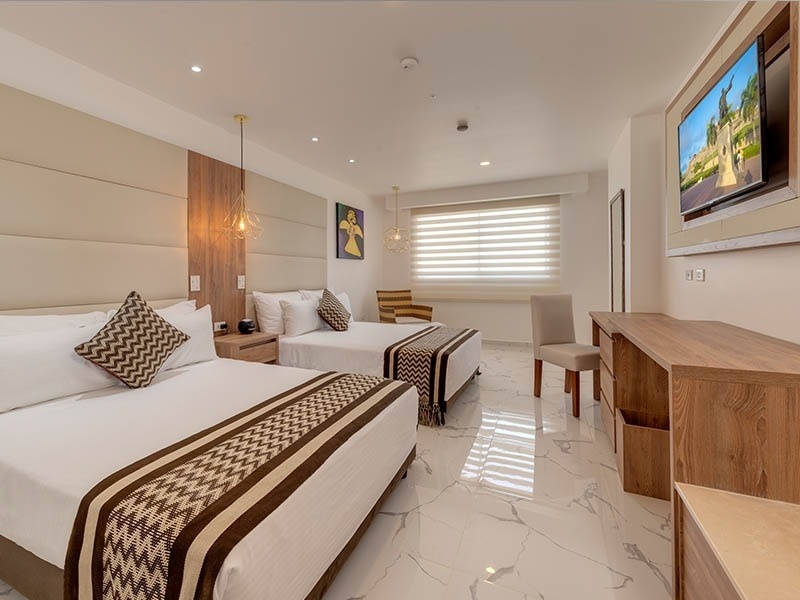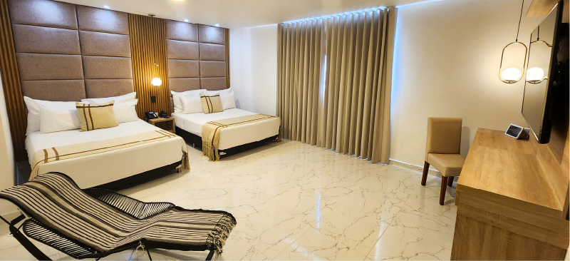 Cómodas y confortables habitaciones de 30M²., muy bien dotadas, donde vivirá una experiencia única de hospitalidad, servicio y confort. Sus grandes espacios la hacen el lugar ideal para relajarse y descansar. Cuenta con dos (2) camas dobles y (1) Sofá cama doble (para tercer adulto y/o persona adicional).