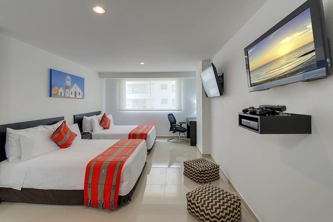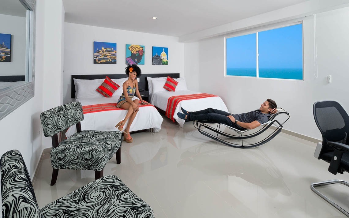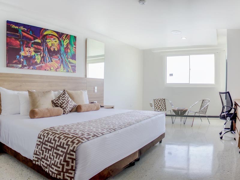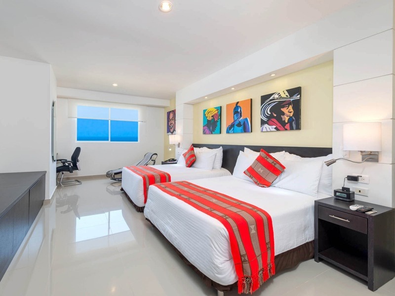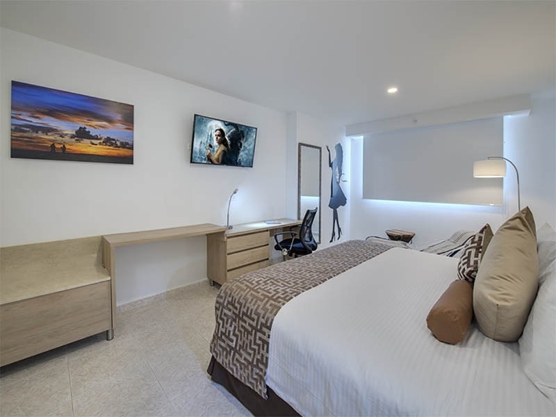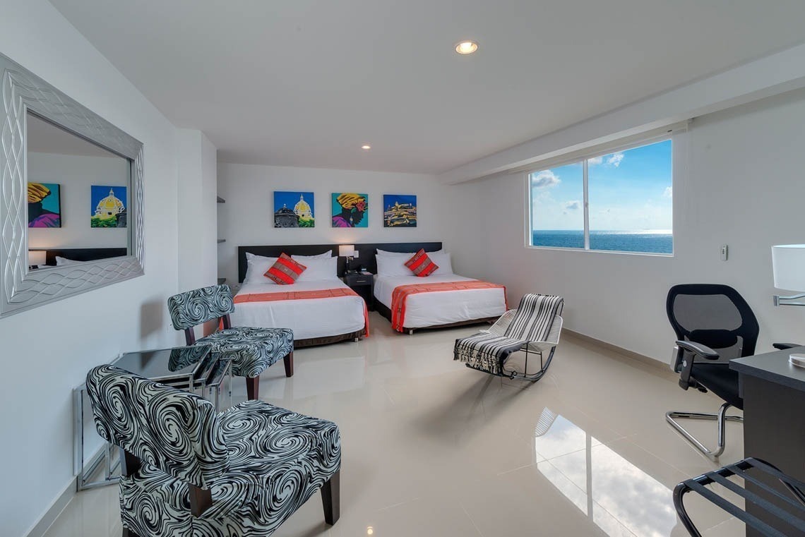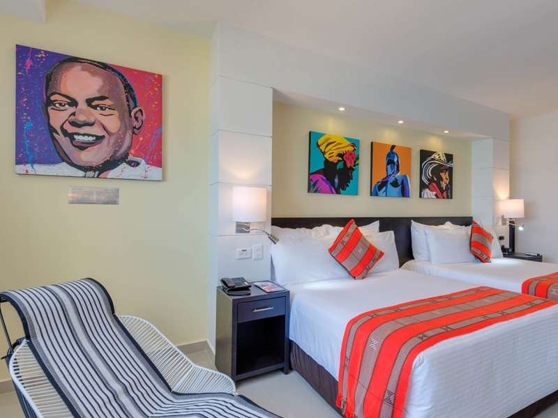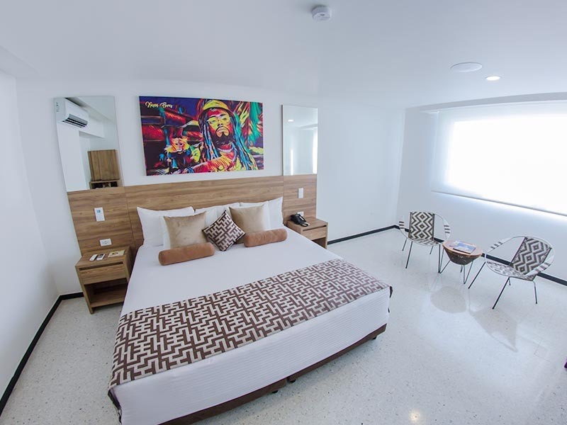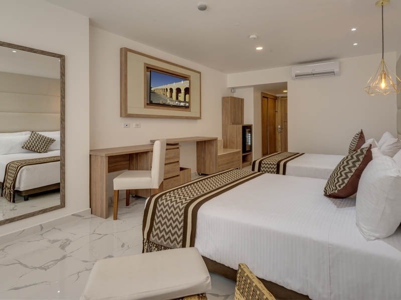 Cómodas y confortables habitaciones de 30M²., muy bien dotadas, donde vivirá una experiencia única de hospitalidad, servicio y confort. Sus grandes espacios la hacen el lugar ideal para relajarse y descansar. Cuenta con dos (2) camas dobles y (1) Sofá cama doble (para tercer adulto y/o persona adicional).
